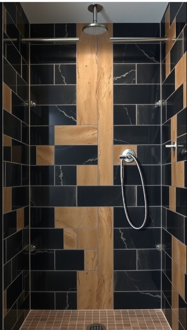 Designing a black-and-tan shower is all about creating a striking yet balanced look. In this design, black and tan tiles are arranged to complement each other perfectly—the dark tones add depth, while the lighter shades bring warmth and softness.