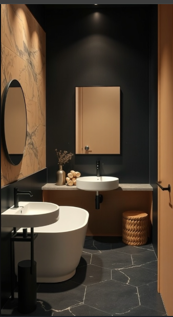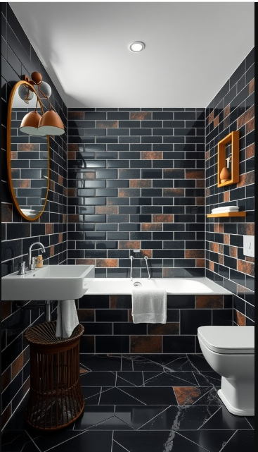 In bathroom design, black tiles paired with tan accents create a bold and sophisticated visual impact. This combination adds elegance while maintaining a warm, inviting atmosphere, as demonstrated in the image.