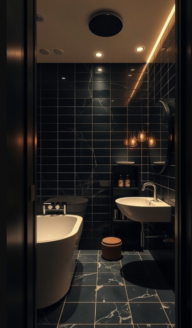 Lighting is key to creating the perfect ambiance in a black-and-tan bathroom. The contrast between dark tiles and lighter fixtures can be enhanced with the right illumination, making the space feel warm and inviting without overwhelming it.