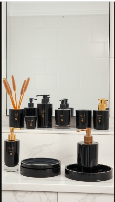Black and tan bathrooms radiate elegance and sophistication, especially when complemented by thoughtfully chosen accessories. Sleek black containers, like those in the image, introduce a modern touch, giving the space a curated, stylish feel.