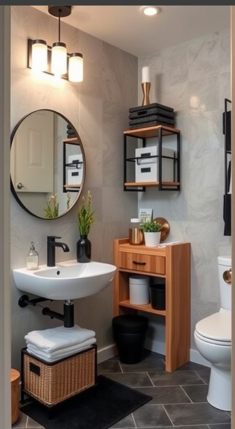 Woven baskets are a practical and stylish addition. Natural textures bring warmth, while a black basket can serve as a bold accent piece. Fill it with rolled towels or decorative items to make it both functional and visually appealing.