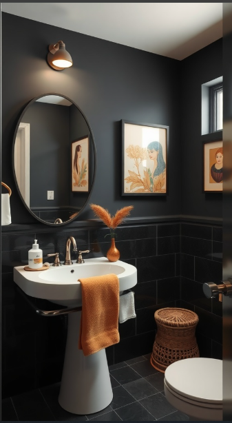 This bathroom features a stunning combination of black and tan tones, creating a space that feels both cozy and sophisticated. The dark walls set a dramatic tone, serving as the perfect backdrop for the carefully chosen decor.