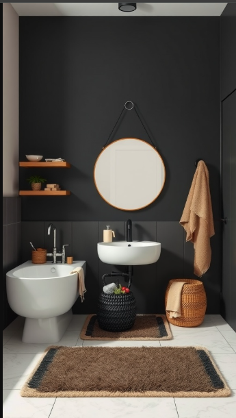 By combining black and tan with varied textures, this bathroom achieves a unique aesthetic that is both welcoming and chic—a perfect example of how contrasting elements can harmonize beautifully in a modern space.