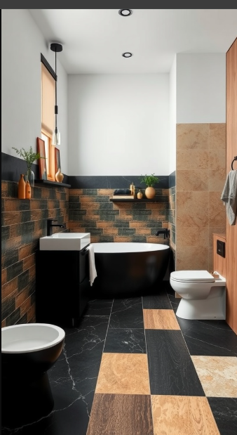 You can also explore mixing materials to add visual interest. Combining different textures or tile patterns—such as matte black with tan wood-look planks—can make the flooring a design feature in itself. Just be sure the tones and finishes complement the rest of your bathroom for a cohesive, stylish result.