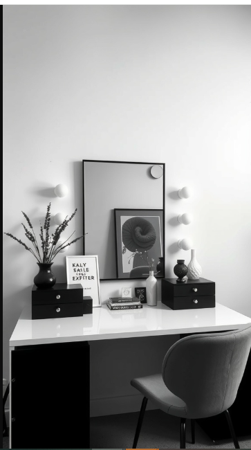 This thoughtful blend of black and white design proves that even small spaces can be elevated into expressive, engaging environments with the right artistic details.