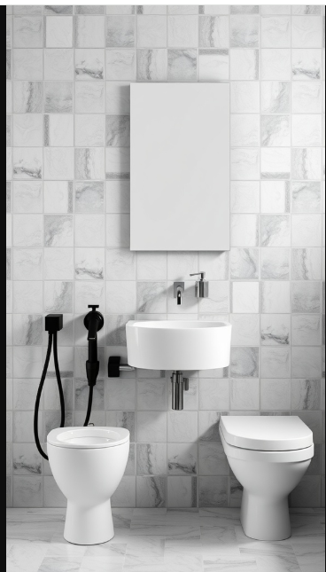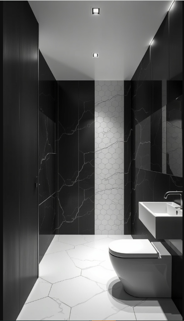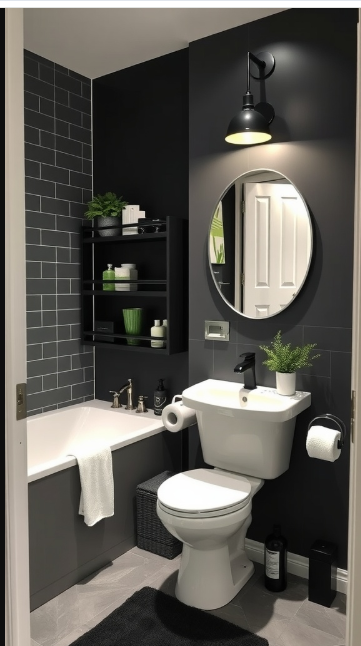 In a black, white, and green bathroom, smart storage plays a vital role in keeping the space organized and stylish. Here, every detail is thoughtfully designed to balance function with aesthetics. The dark wall tiles create a modern backdrop, while the lighter fixtures stand out against the contrast.