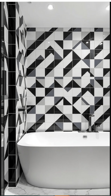 The black-and-white wall tiles in this bathroom make a striking statement, with each geometric pattern adding a sense of artistry and dimension to the space. The high-contrast palette draws the eye, creating depth while setting a bold, modern tone.