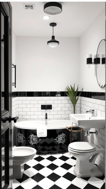 A simple green plant introduces freshness, softening the monochrome palette and adding a natural element. Altogether, this space shows how Art Deco design can be reimagined in a contemporary way, creating a bathroom that feels stylish, welcoming, and cohesive.