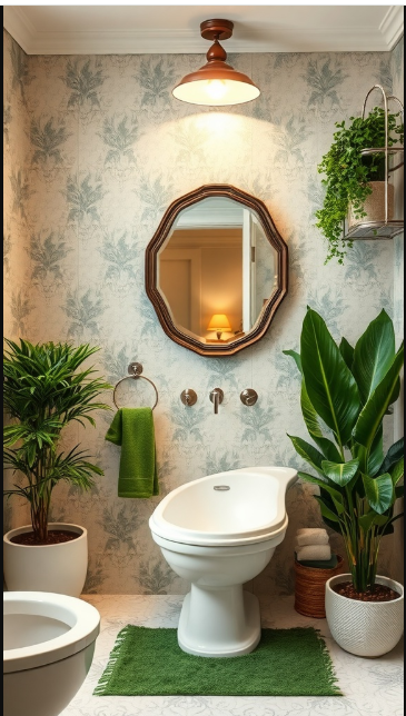 A round mirror with a warm wood frame adds a rustic charm, reflecting light to make the room feel brighter and more spacious. Altogether, these thoughtful green accents turn the bathroom into a cozy, serene retreat—ideal for moments of relaxation.