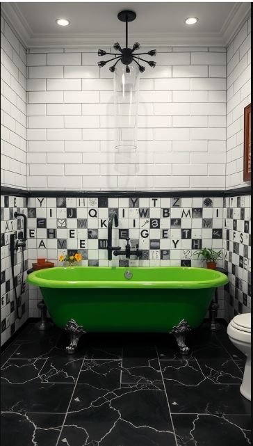 Set against a backdrop of black-and-white tiled walls, the tub creates a striking visual contrast. The glossy green finish adds a lively pop of color while maintaining an air of elegance.
