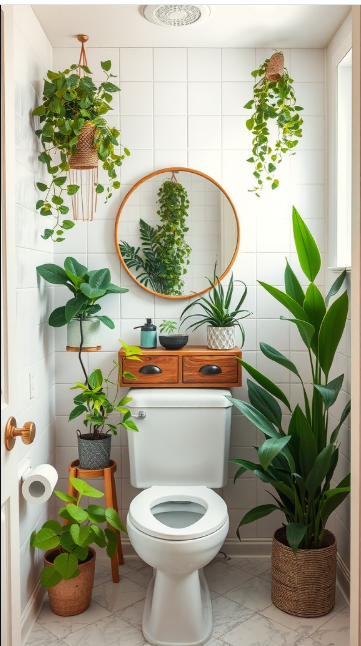 Greenery brings the look to life, with hanging plants and potted varieties adding vibrant pops of color against the crisp backdrop. Beyond their beauty, plants contribute to cleaner air and a calming vibe, turning the bathroom into a serene, spa-like retreat.