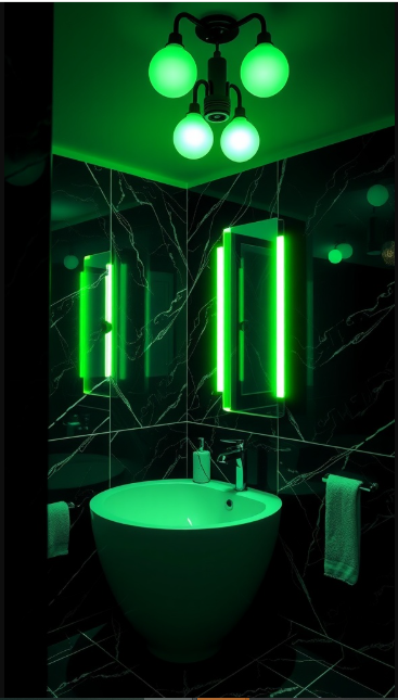 This bathroom makes a bold statement with striking green lighting fixtures that instantly elevate the design. A central fitting with round green bulbs sets a playful yet sophisticated tone, casting a distinctive glow throughout the space.