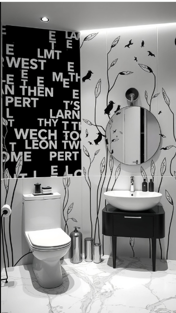The delicate illustrations of birds and leaves introduce a natural touch, softening the boldness of the text and adding a sense of playfulness. Together, the contrast between the sleek fixtures and the artistic backdrop makes the bathroom feel both stylish and personal.