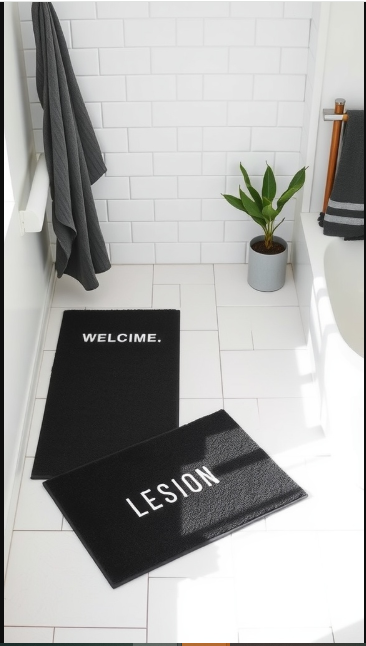 Each mat features playful typography—one with the word WELCOME and the other with LESION. This quirky detail adds personality, making the space feel fun and memorable while setting a welcoming tone. The strong lettering also doubles as a design statement, giving the bathroom a unique edge.