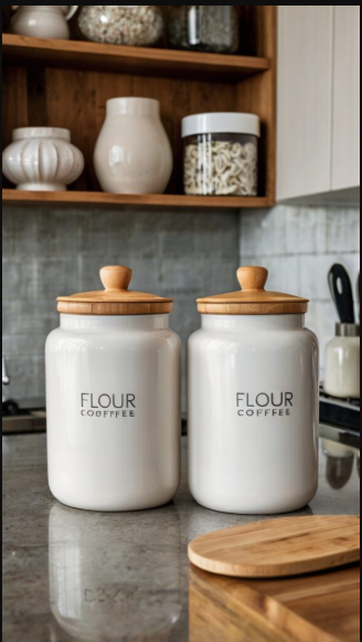 Display stylish canisters to store essentials like flour, sugar, and coffee, keeping them handy while enhancing your kitchen décor. Select materials such as ceramic, glass, or metal to complement your design. Clear canisters make it easy to monitor supplies, while labeled containers create a tidy, organized appearance.