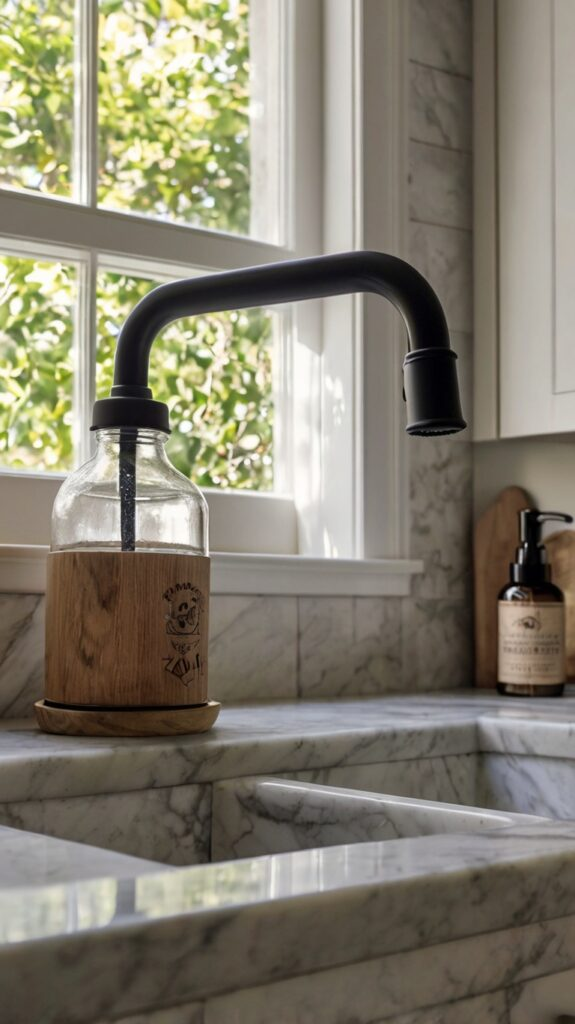 Swap out plastic soap bottles for elegant glass or ceramic dispensers for both dish and hand soap. A chic soap dispenser set enhances the look of your sink area while helping reduce plastic waste. Choose matching designs that complement your faucet and sink for a cohesive, polished appearance.