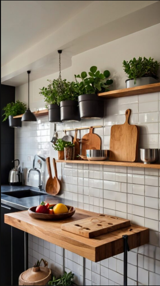 A sleek hanging rail with hooks for utensils and small pots combines style and functionality. It keeps everyday kitchen tools within easy reach while adding an industrial or modern touch. Opt for stainless steel or matte black finishes for a contemporary, polished look.