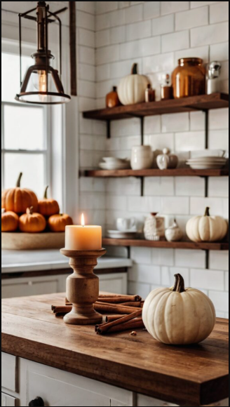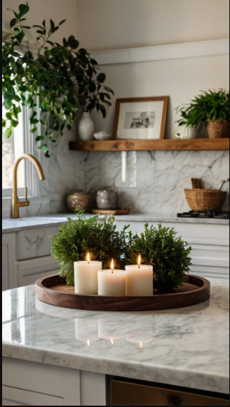 Scented or decorative candles bring a warm, inviting ambiance to your kitchen. Arrange candles of varying heights and styles to add visual interest and a cozy feel. Choose seasonal scents to enhance the atmosphere and make the space even more welcoming.