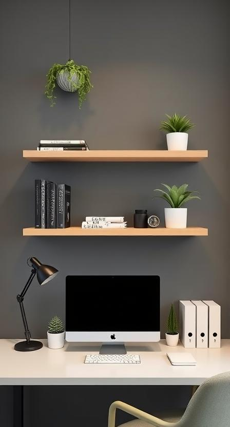 Floating shelves are an excellent way to maximize space while showcasing décor such as books, awards, or small plants. Keep them neatly arranged and uncluttered to maintain a polished, professional look.