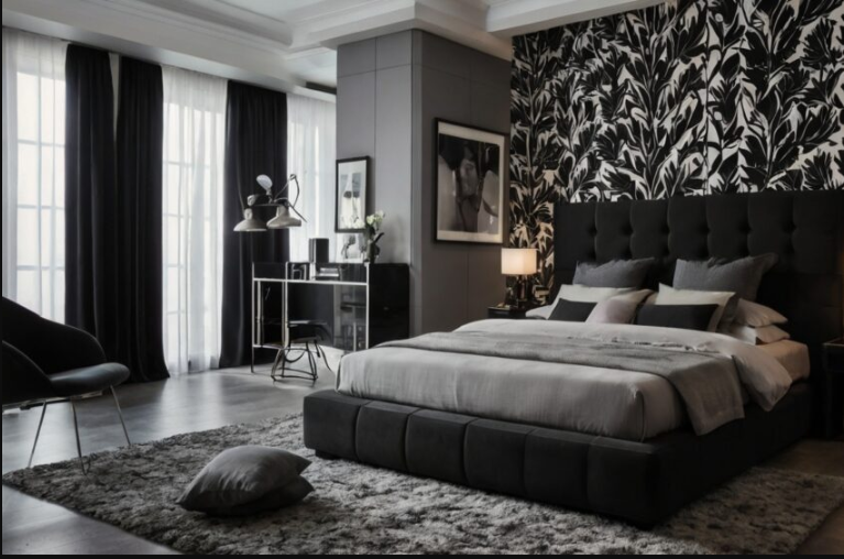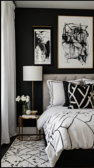 Design a sleek, modern bedroom featuring crisp white walls, bold black furniture, and minimal decor. Embrace clean lines and subtle patterns to achieve a contemporary vibe. Keep accessories to a minimum for a clutter-free look, and elevate the space with a striking black-and-white rug or statement artwork.