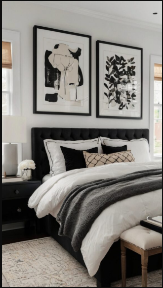 Combine a black-and-white palette with antique-style furniture, chandeliers, and vintage décor to create a timeless, old-world charm. Opt for ornate bed frames, distressed dressers, and detailed moldings to complete the look. Accentuate the space with vintage-framed prints or black-and-white photographs to enhance the classic aesthetic.