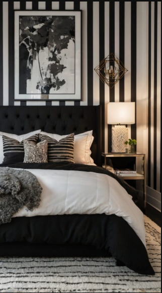 Introduce bold contrast with black and white striped walls or bedding to bring energy and style to your space. Stripes add visual intrigue and a modern edge—choose vertical stripes to make the room feel taller or horizontal ones to create a sense of width. Complete the look with matching striped cushions or curtains for a cohesive finish.