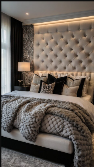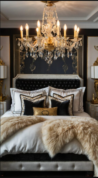 Infuse your black and white bedroom with luxury by incorporating rich textures and elegant details like velvet, gold accents, and a statement chandelier. A tufted headboard in either black or white adds a plush, refined touch, while mirrored furniture or metallic decor pieces elevate the space with a glamorous sheen.