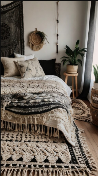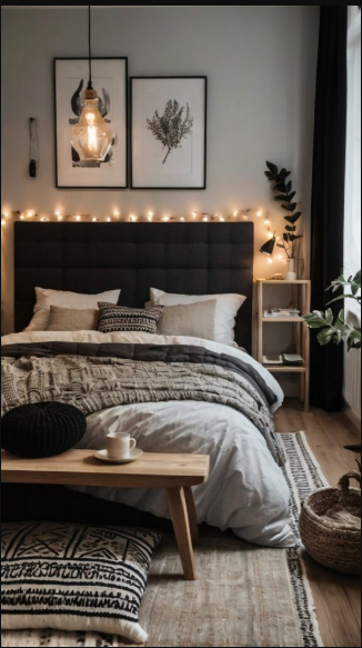Combine bohemian touches—such as woven rugs, textured bedding, and macramé wall hangings—with a monochrome palette for a relaxed yet stylish look. Use natural materials like rattan or jute to introduce an organic vibe, and layer black-and-white patterns to add depth and personality to the space.