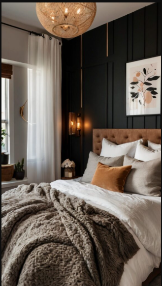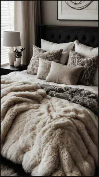 Create a cozy and inviting bedroom with plush white bedding, black throw pillows, and layered textiles. Incorporate faux fur blankets, knitted throws, and textured cushions to add warmth and dimension. Complete the look with a soft white rug beneath the bed to enhance the comforting ambiance.