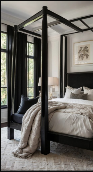 A black canopy bed brings sophistication and grandeur to a black and white bedroom. For a soft, romantic vibe, adorn it with sheer white drapes, or keep it open for a sleek, modern aesthetic. Complete the look with monochrome bedding and subtle gold or silver accents for an elegant finishing touch.