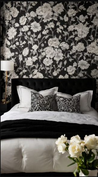 Introduce floral wallpaper, bedding, or artwork in black and white to add a romantic and elegant touch. Opt for delicate floral patterns for a feminine feel or bold botanical designs for a more dramatic look. Complement the space with soft lighting and timeless furniture to preserve a sophisticated ambiance.
