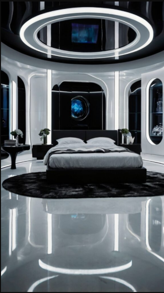 Embrace a sleek, high-gloss black-and-white aesthetic with modern, futuristic furniture and LED lighting. Incorporate mirrored surfaces, metallic details, and minimalist designs to elevate the ultra-modern vibe. Add smart lighting features to create a dynamic, high-tech atmosphere.