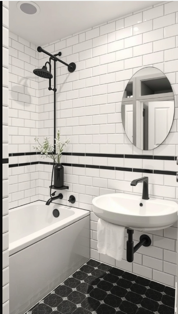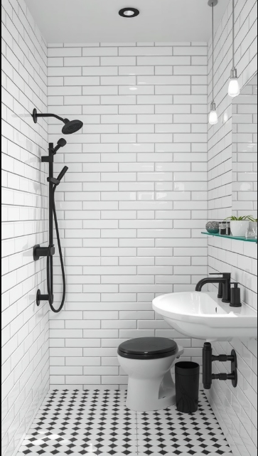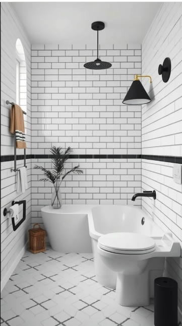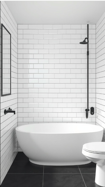 When selecting tiles for your bathroom, sustainability is an important factor to keep in mind. The image highlights a chic design featuring white tiles with black grout—a look that can be both stylish and eco-friendly. Choosing tiles made from recycled materials or sustainably sourced products helps reduce environmental impact without compromising on aesthetics.