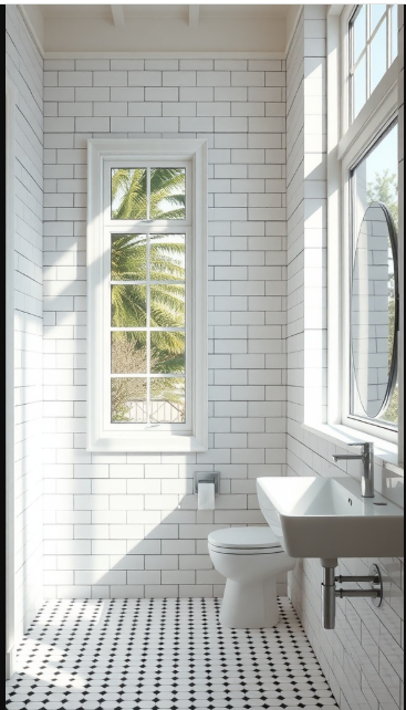 Natural light can completely transform a bathroom, making it feel bright, airy, and inviting. In the image, large windows allow sunlight to pour in, highlighting the crisp lines of the white tiles and the striking contrast of black grout. The result is a refreshing atmosphere, perfect for energizing morning routines or a relaxing soak.