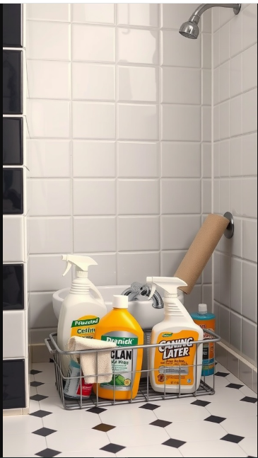 Keeping a white tile and black grout bathroom looking fresh comes down to regular care. The image highlights a neatly arranged set of cleaning supplies—a reminder that having everything within reach makes upkeep simple and efficient.