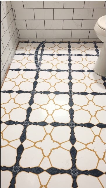 The intricate floor pattern works seamlessly with the classic white subway tiles on the walls. Black grout accentuates the shapes and details, giving the floor a sense of artistry and making it a natural focal point that draws the eye.