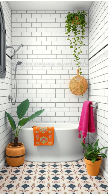 This bathroom demonstrates how vibrant accents can enliven a classic white tile and black grout design. The crisp white tiles create a clean backdrop that lets colorful details take center stage.