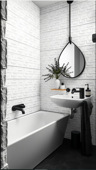 The textured wall tiles interact beautifully with light and shadow, adding depth and visual interest that makes the space feel more inviting. Sleek black fixtures enhance the contrast, giving the room a polished, contemporary vibe.