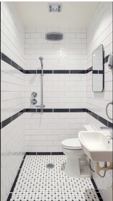 In any bathroom, the floor plays a major role in setting the overall tone of the space. The image highlights a stunning tile design where white tiles with black grout create a bold, eye-catching effect. This contrast not only adds depth but also transforms the bathroom into something truly special.