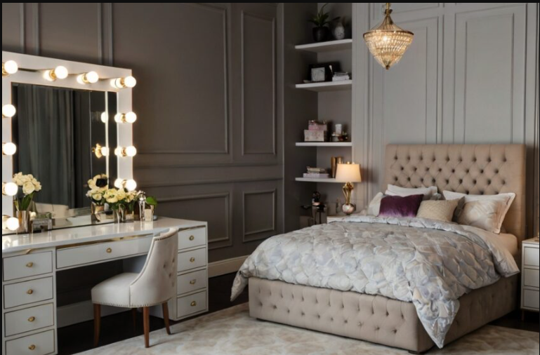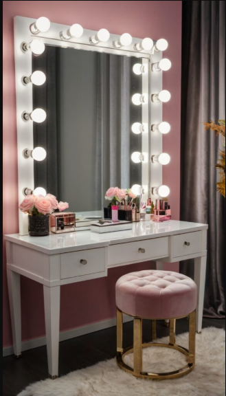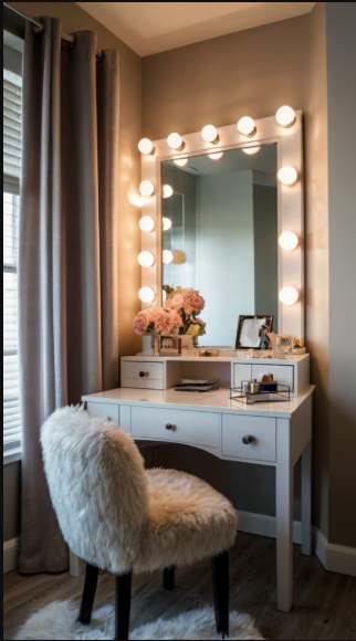 A vanity with hidden compartments or under-table storage is perfect for keeping clutter neatly tucked away. Opt for designs with lift-up panels or pull-out drawers for effortless organization. A foldable mirror allows the vanity to double as a desk when needed, making it an excellent choice for multi-functional bedroom spaces.