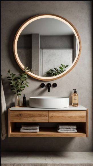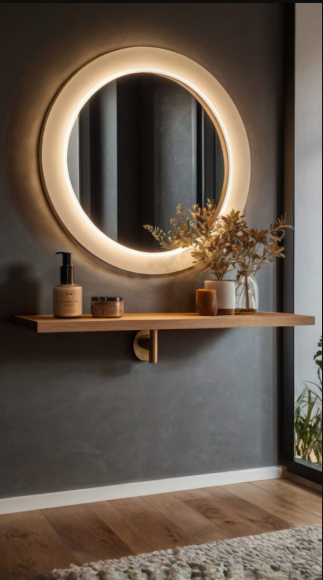 Mount a floating shelf with a round mirror for a space-efficient, modern design. This arrangement offers a sleek, airy feel, ideal for minimalist interiors. Adding a hidden LED strip behind the mirror introduces a contemporary touch while improving functionality. Complete the look with a simple stool that can be neatly tucked away when not in use.