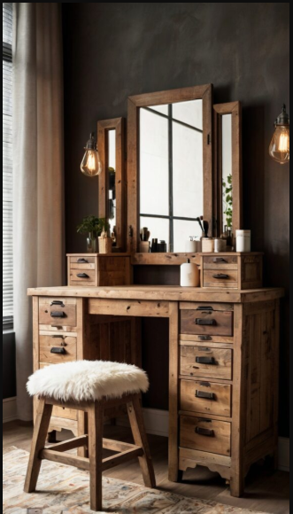 A natural wood vanity paired with a vintage-style stool and soft lighting evokes a warm, countryside charm. Choose distressed or reclaimed wood to enhance the rustic appeal. Add touches like a woven basket, a small potted plant, or a candle to bring extra warmth and character. This setup is ideal for those who appreciate earthy tones and a relaxed, inviting atmosphere.