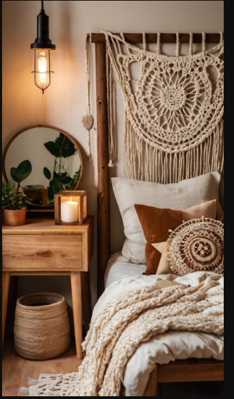 Embrace a relaxed bohemian vibe by incorporating macramé, natural textures, and warm tones. A rattan or wooden vanity table enhances the free-spirited aesthetic, while fairy lights, potted plants, and a patterned rug complete the look. A round mirror with a wooden or woven frame perfectly ties the entire setup together.