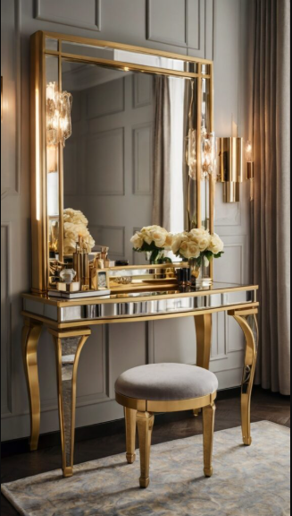 A fully mirrored vanity amplifies light and infuses the room with glamour. Its reflective surfaces create a sense of openness, ideal for smaller bedrooms. Mirrored drawers provide discreet storage without compromising the sleek design, and a velvet stool adds a touch of sophistication to complete the look.