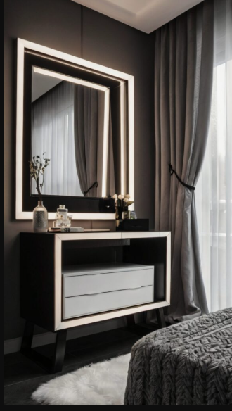 A high-tech vanity featuring LED-lit mirrors provides ideal lighting for flawless makeup application. Smart touch controls let you adjust brightness, perfect for beauty enthusiasts. Sleek surfaces, like glossy white or acrylic tabletops, enhance the futuristic aesthetic. This vanity combines practicality with striking, modern design.