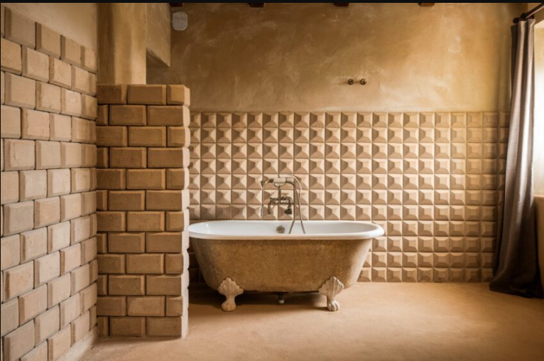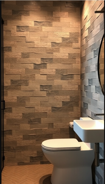 Lighting plays a key role in showcasing textured tiles. As seen in the image, soft overhead light accentuates the tiles’ contours, enhancing their depth and character, and making the bathroom feel cozy and thoughtfully designed.