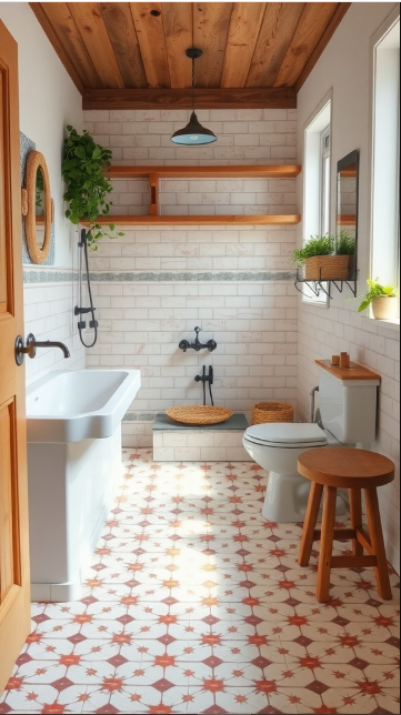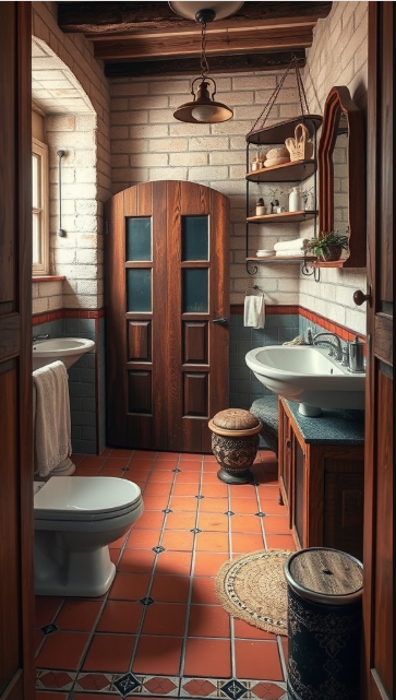 To enhance the rustic vibe, pair terracotta tiles with natural materials such as wood and stone. Accessories like woven baskets or potted plants can further enrich the design. With these thoughtful touches, you can create a bathroom that is not only functional but also full of character and warmth.