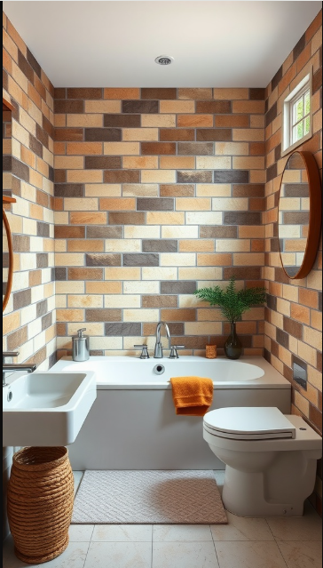 Paired with simple fixtures, the focus remains on the walls. The white bathtub and sink provide a striking contrast against the earthy tiles, grounding the overall design. Small accents, like an orange towel and a woven basket, add texture and subtle pops of color that complement the rustic vibe. Meanwhile, a few small plants on the tub ledge introduce a touch of nature, enhancing the serene, inviting atmosphere.