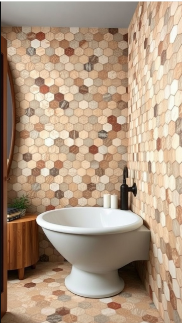 Hexagon mosaic patterns add a distinctive and charming touch to any rustic bathroom. In the image, warm-toned hexagonal tiles create an inviting atmosphere, with a harmonious blend of creamy whites and earthy browns that adds depth and character.
