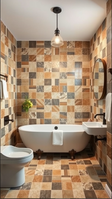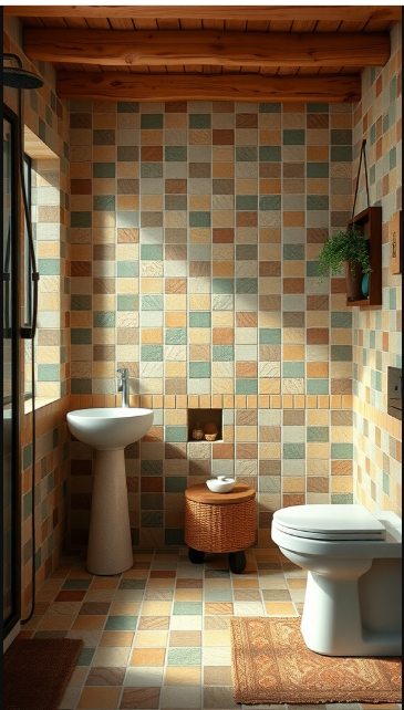 Patchwork tile designs are a playful way to bring personality to your bathroom. By combining different colors and patterns, this style creates a visually captivating space. In the image, earthy tones give the room a warm and inviting ambiance.